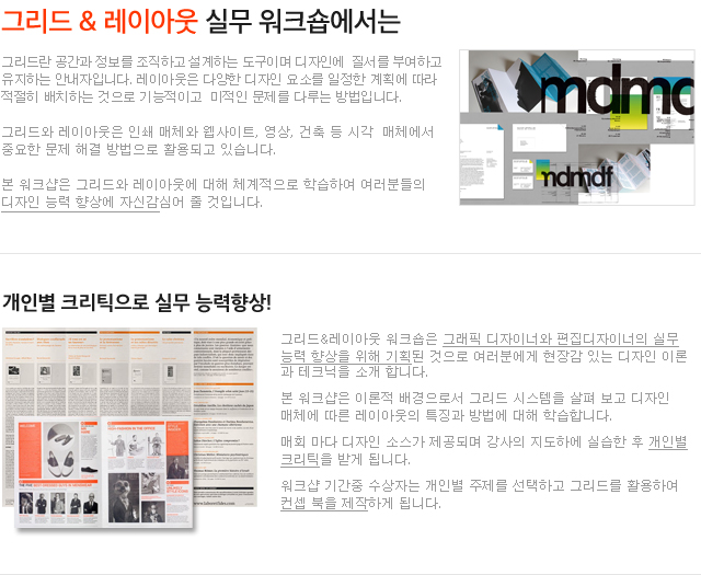 ![]() 오리엔테이션/ 그리드의 다양한 유형/규격과 구조/ 타이포그래피 환경 실습 : 단행본 본문 디자인(문학, 인문, 경제경영, 실용서 중 선택) 과제 : 사물수집 주제 선정 |